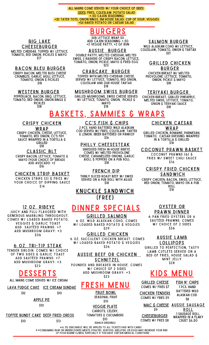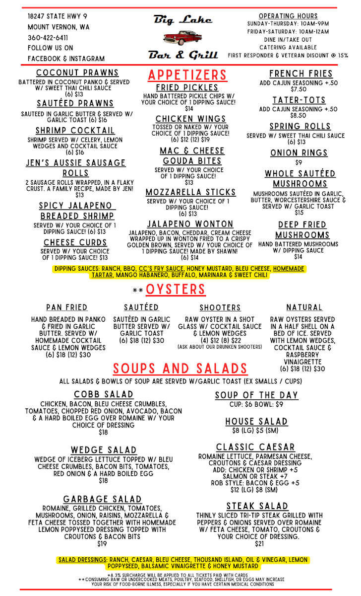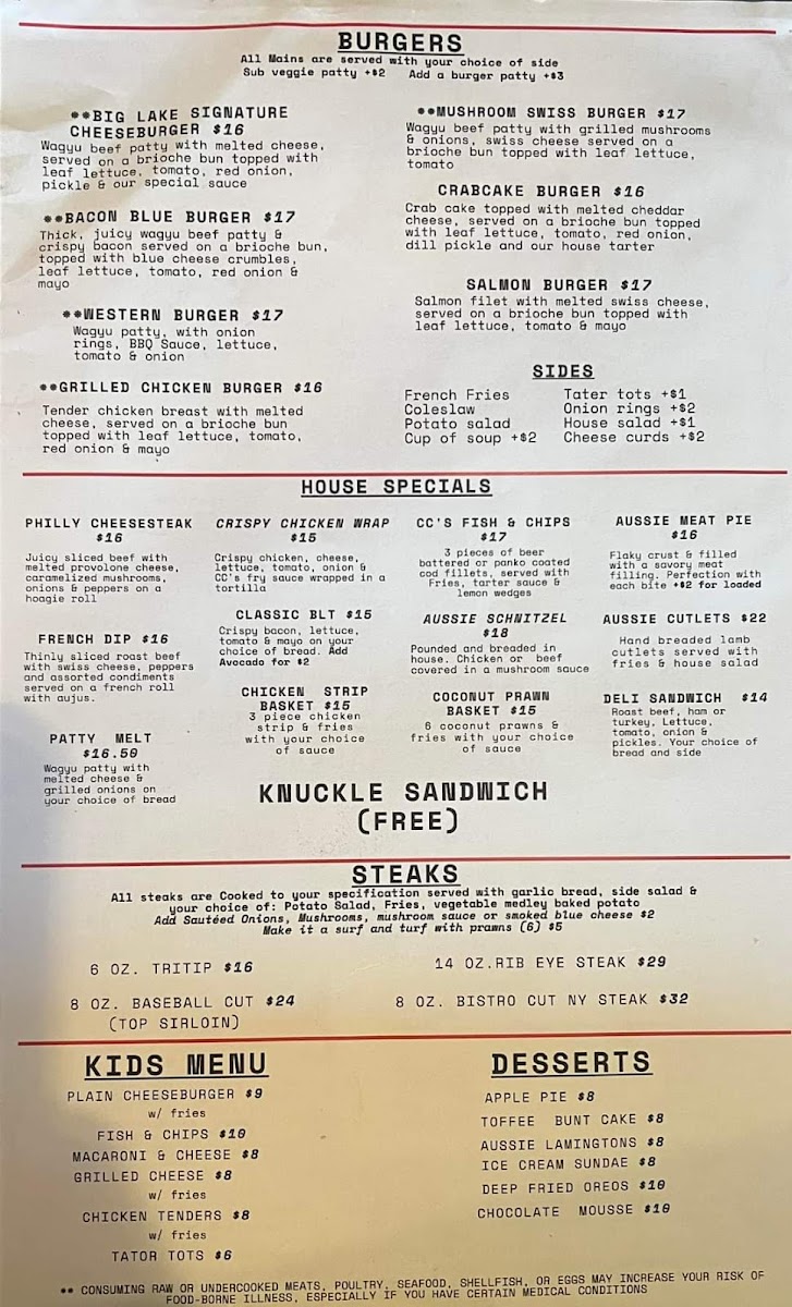 The menu at Big Lake Bar & Grill offers a relaxed, approachable selection that fits perfectly with its casual lakeside setting. You’ll find a variety of hearty sandwiches, classic bar baskets, and well-crafted burgers made with fresh ingredients and generous portions. Whether you’re stopping by for a midday meal, an afternoon bite, or evening comfort food, the menu caters to those looking for satisfying, familiar flavors.