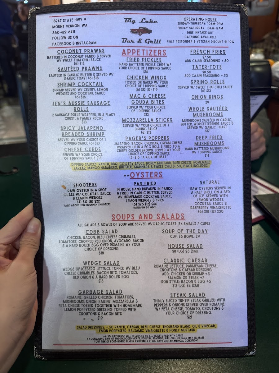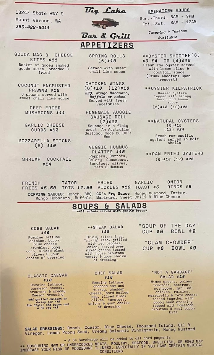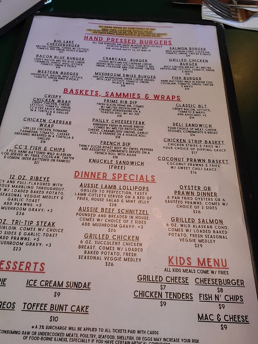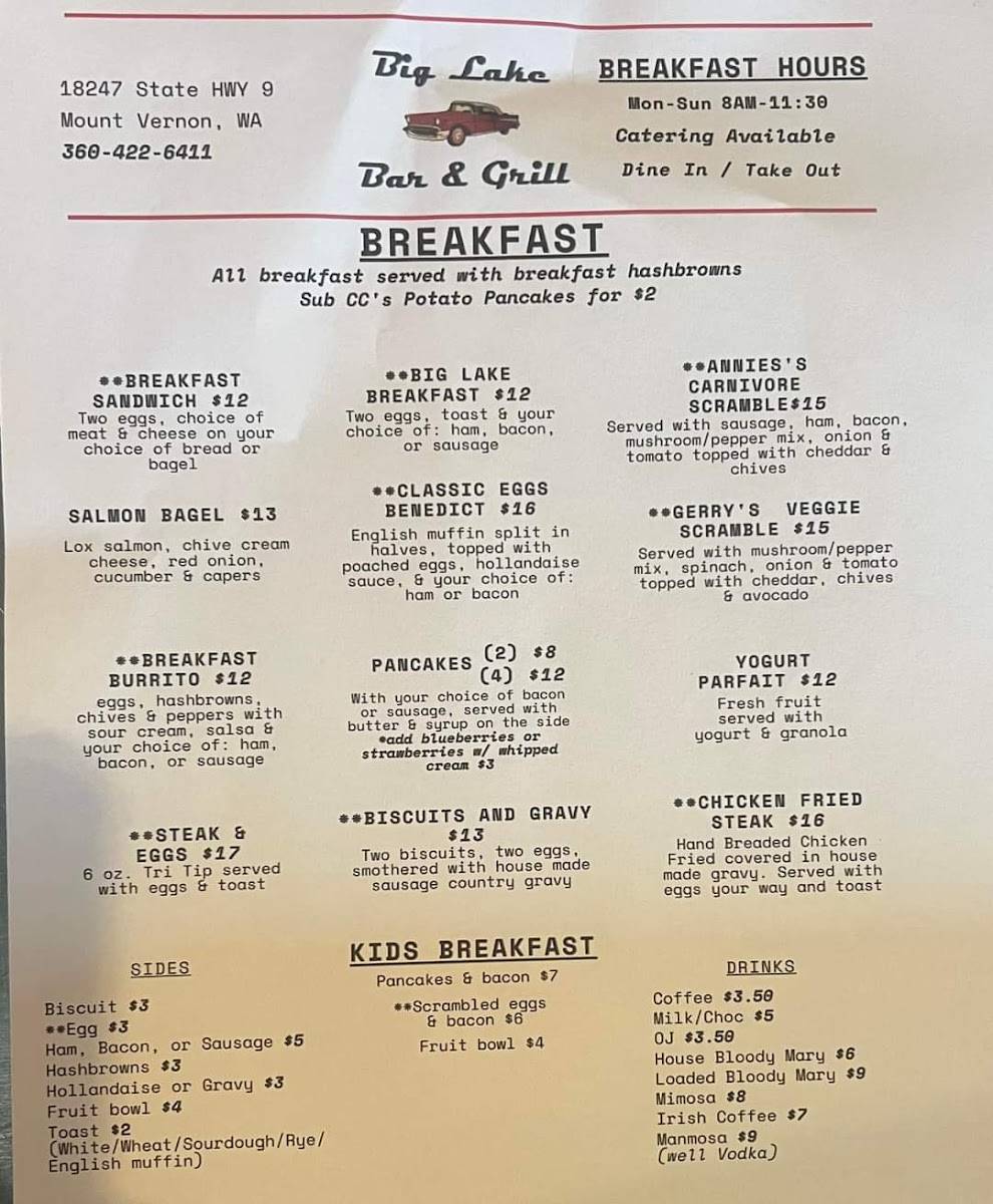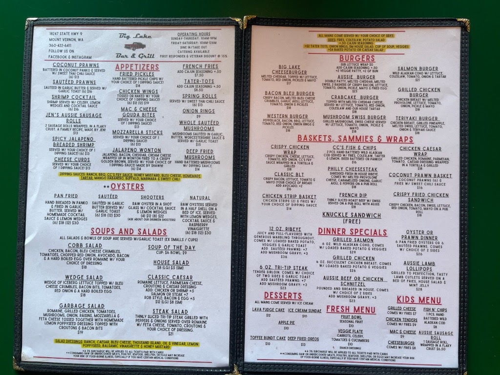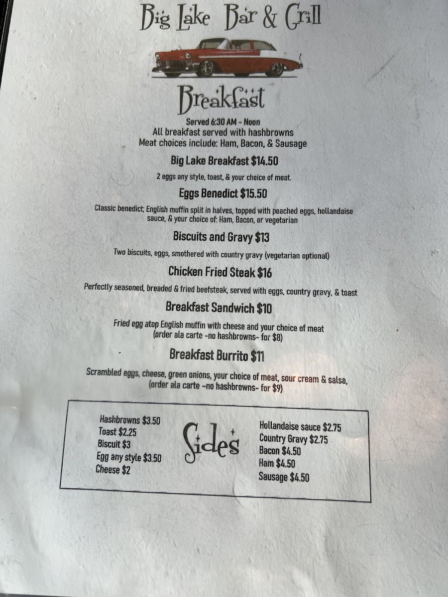 Big Lake Bar & Grill also offers a thoughtful range of drinks to complement the food—from coffee and Irish coffee to refreshing mimosas and creative cocktails. These pair well with the laid-back atmosphere, making it easy to linger over a meal or unwind with a drink. The kids’ menu keeps little ones in mind with simple, familiar favorites like grilled cheese and chicken tenders.